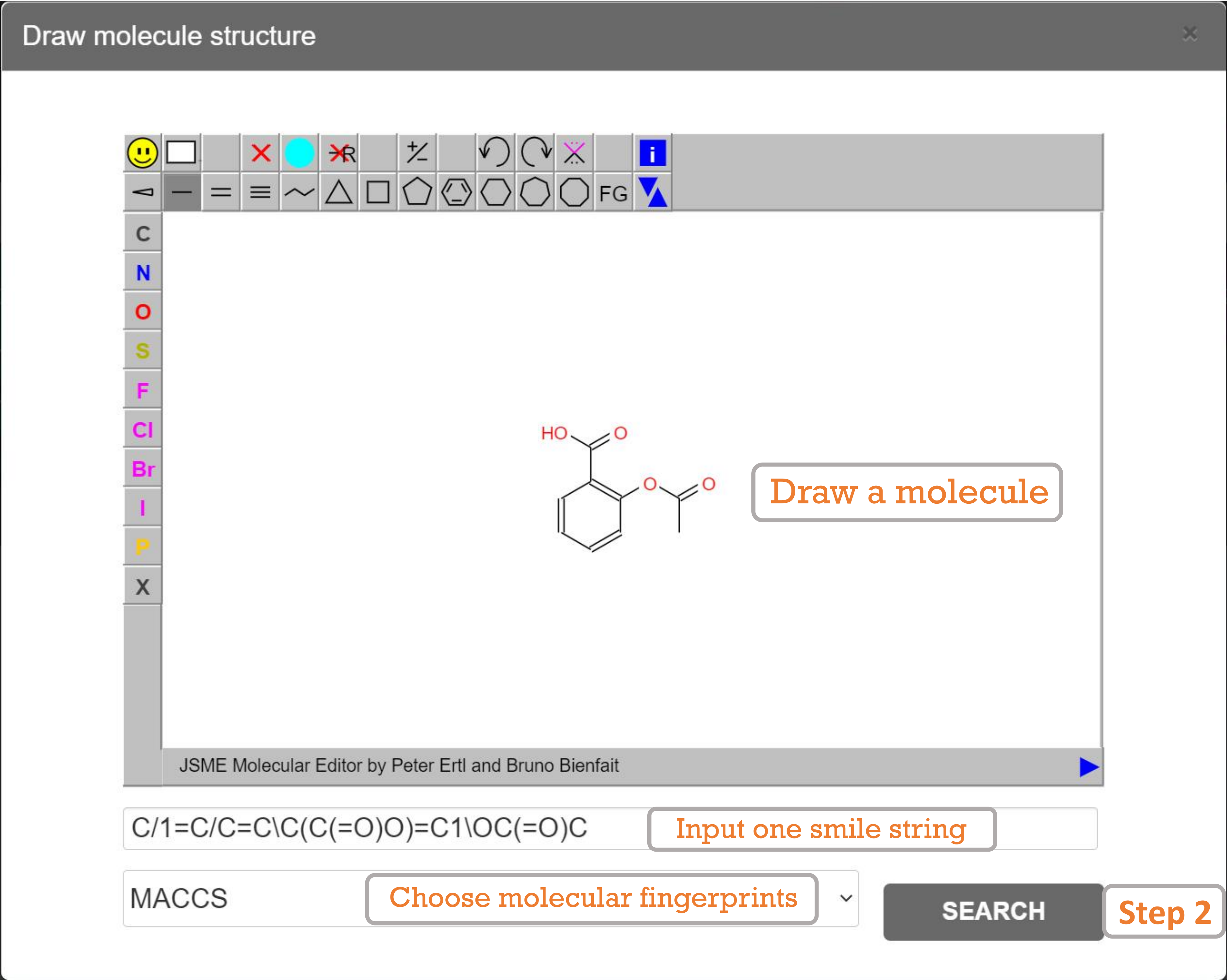 First, click on "Draw molecule" and enter the smiles formula or draw small molecules via the toolbar.